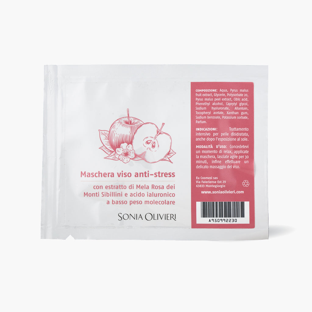100% bamboo tissue face mask with Sibillini Mountains Pink Apple extract , low molecular weight hyaluronic acid and allantoin. It is an intensive treatment for dehydrated skin after sun exposure .