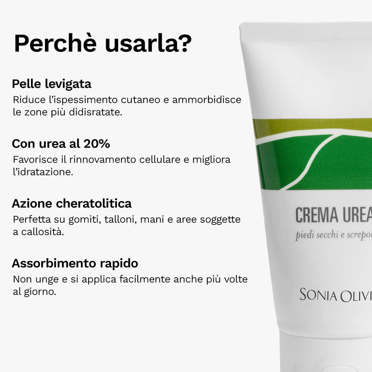 La presenza di Urea al 20% conferisce alla crema una spiccata azione emolliente e cheratolitica, utile per ammorbidire e levigare la pelle ispessita e secca.