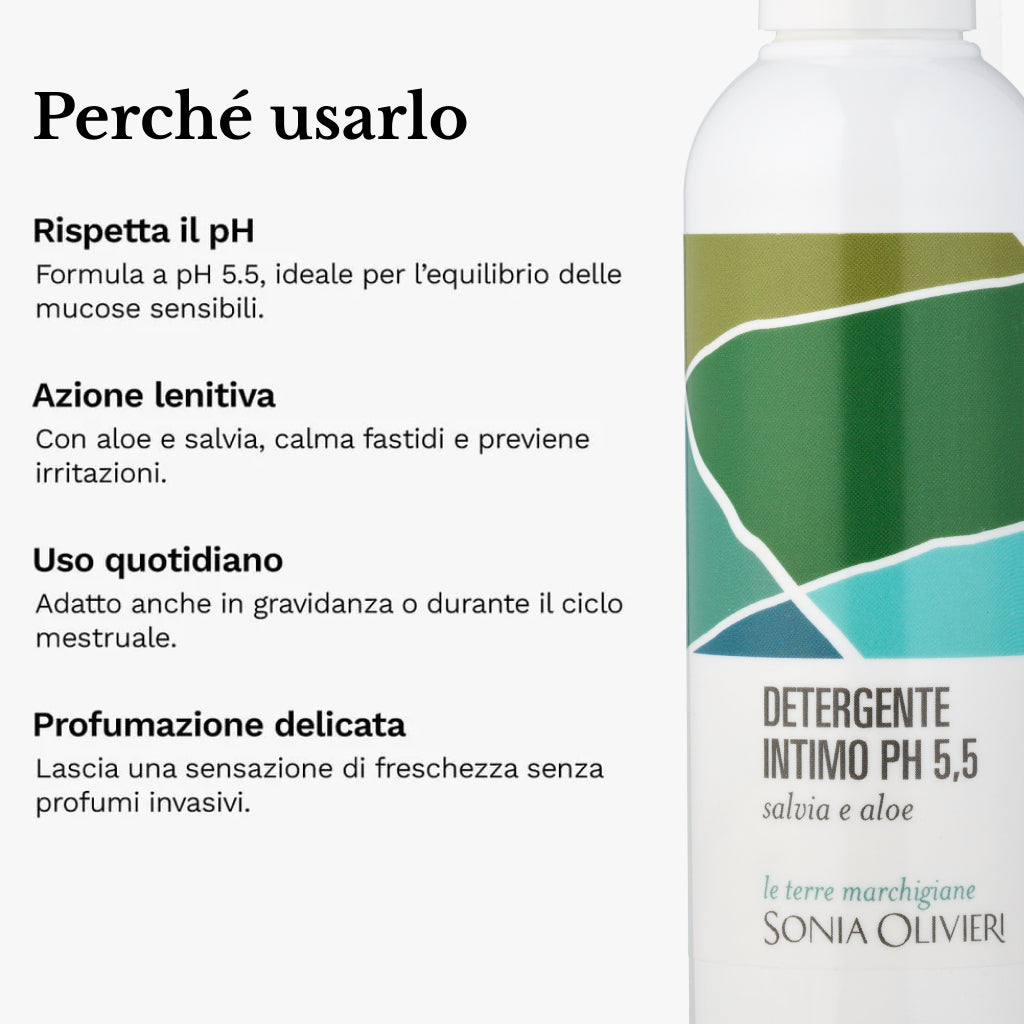 Il Detergente Intimo pH 5,5 sfrutta le proprietà di Salvia Officinalis e Aloe Barbadensis per offrire un effetto lenitivo e idratante, contribuendo a calmare eventuali fastidi o secchezza.