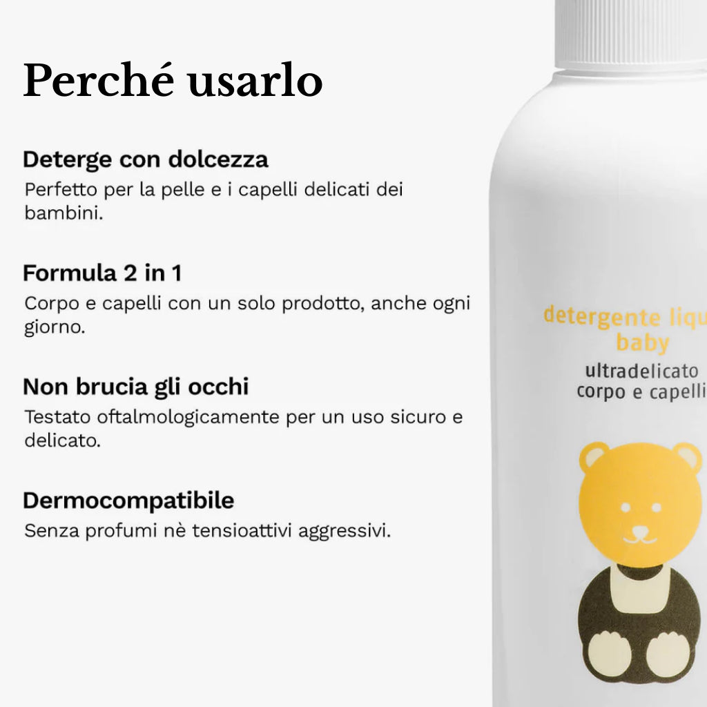 Il Detergente Liquido Baby Corpo e Capelli è perfetto per chi cerca un prodotto sicuro, delicato e privo di sostanze aggressive per l’igiene quotidiana del bambino. Rispetta la cute sensibile e aiuta a mantenere la pelle morbida, pulita e protetta ad ogni utilizzo.