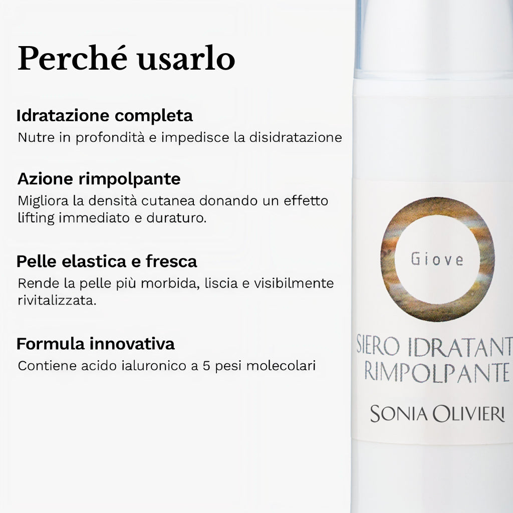 Il siero idratante Giove è un trattamento intensivo ad effetto liftante e rimpolpante, ideale per contrastare la disidratazione e i segni del tempo. Grazie alla presenza di acido ialuronico a 5 pesi molecolari, agisce su più livelli della pelle per un risultato visibile e duraturo. Un alleato quotidiano per chi cerca idratazione profonda e comfort immediato.