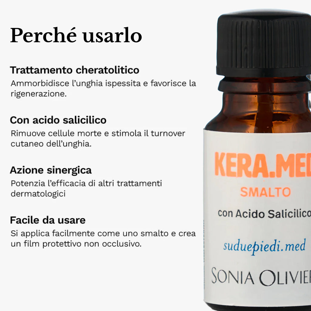 KERA.MED Smalto con Acido Salicilico è la soluzione ideale per chi presenta unghie ispessite, sollevate o alterate da ipercheratosi. Grazie all’azione mirata dell’acido salicilico, aiuta ad assottigliare la lamina ungueale e a prevenire il distacco o lo sfaldamento. Ottimo supporto per potenziare l’efficacia di trattamenti antimicotici o dermatologici.