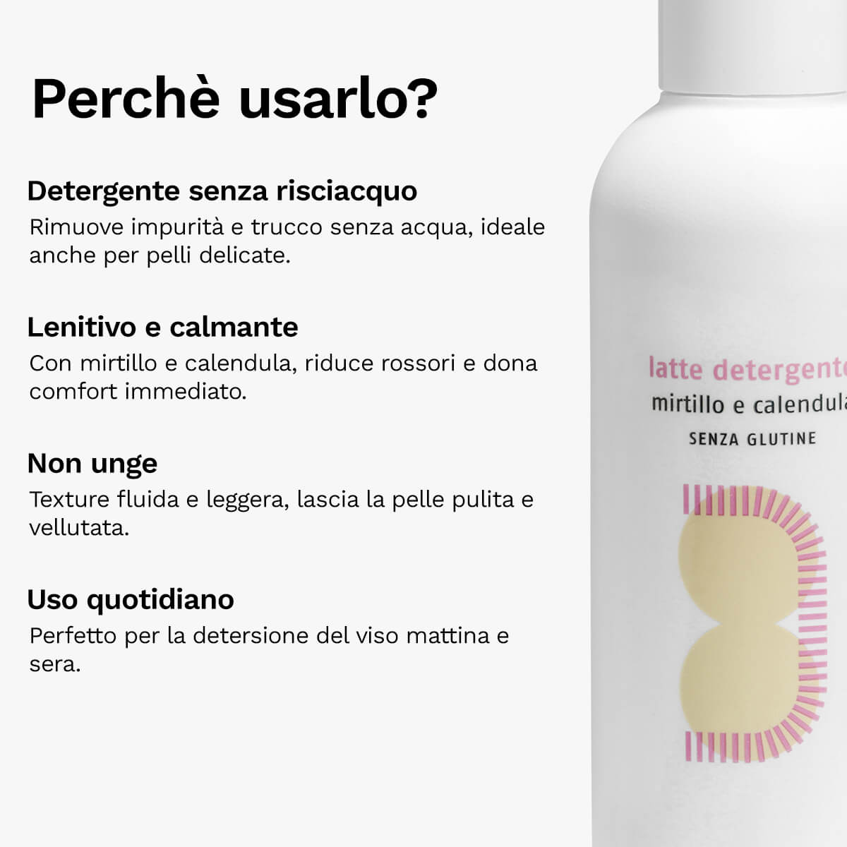 Il Latte Detergente al Mirtillo e Calendula è la soluzione ideale per chi cerca una detersione dolce ma efficace, soprattutto in presenza di pelle sensibile e reattiva. Rimuove delicatamente impurità e make-up, lasciando la pelle fresca, idratata e visibilmente lenita.