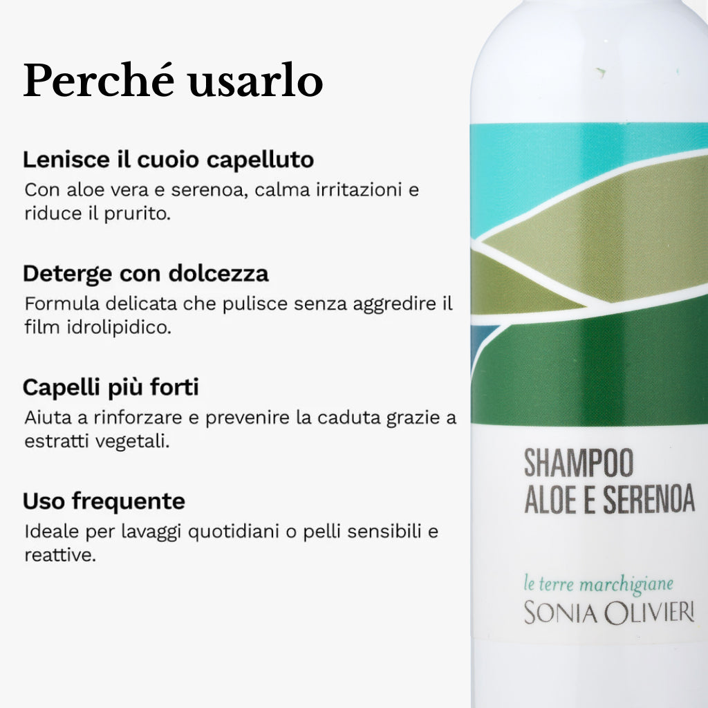 Lo shampoo Aloe e Serenoa è formulato con estratto naturale di Aloe, che svolge un’azione lenitiva e rigenerante sul cuoio capelluto, contribuendo a ridurre eventuali irritazioni.