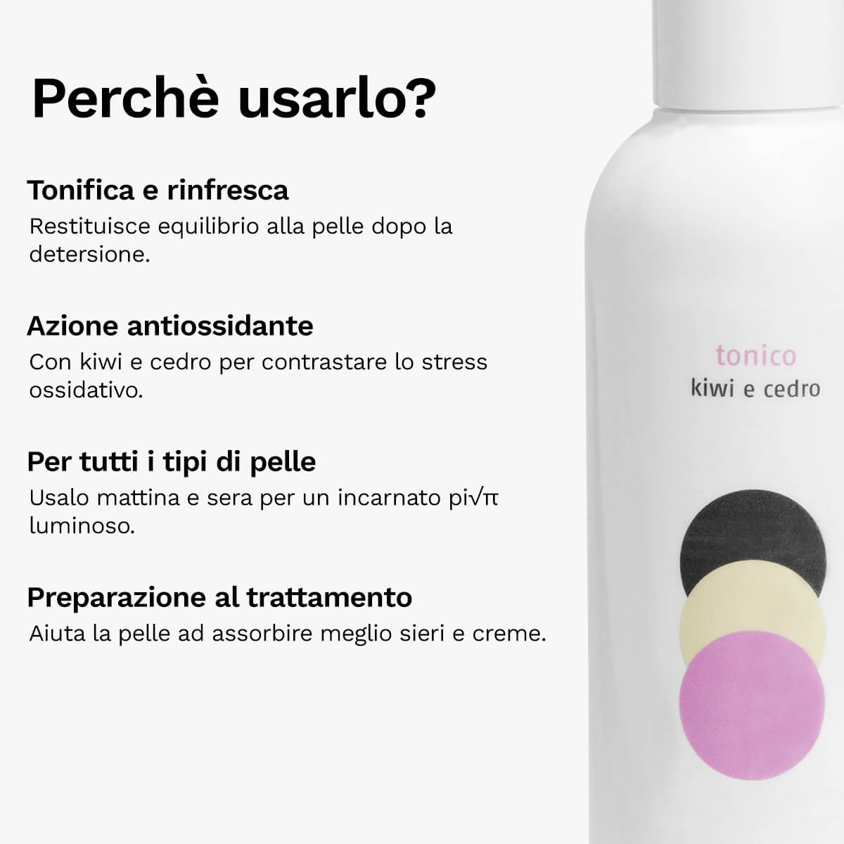 Formulazione ad azione astringente, rimuove i residui di latte detergente lasciando la pelle fresca e luminosa.